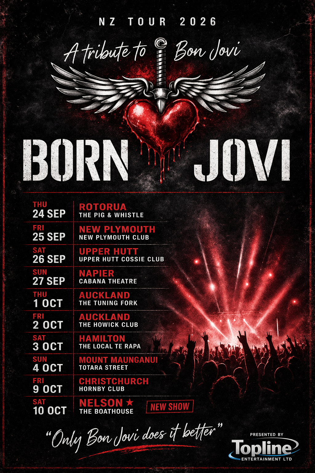 The idea was to recreate a Bon Jovi concert, not just a Bon Jovi “show” but, rather, an experience that encapsulated every magic moment that has lingered from the extraordinary career of this unique band. The cast were chosen and we worked tirelessly rehearsing, based on every piece of audio and visual history that would give us a glimpse into the magic of this legendary rock band in order for us to recreate it….. and the rest, as they say, is history! Spanning almost 25 years now!